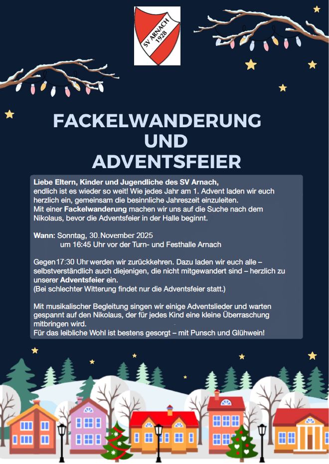 Fackelwanderung / Adventsfeier WANN: 27.11.2022 -16:30 Uhr WO: Xare-Miller-Stadion Arnach mit Nikolausbesuch und Spielstationen für wärmende Verpflegung ist gesorgt Flyer-A5